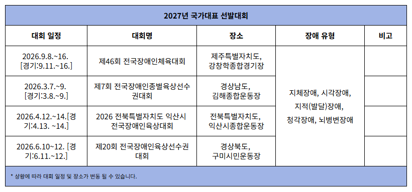 ② 국가대표 선발전은 전국장애인체육대회, 전국장애인종별육상선수권대회, 전국장애인선수권대회이며 선발전이 변경 될 경우, 국가대표선수 선발 공고 전 전문체육위원회에서 심의를 거쳐 선정 후 홈페이지에 공지한다.