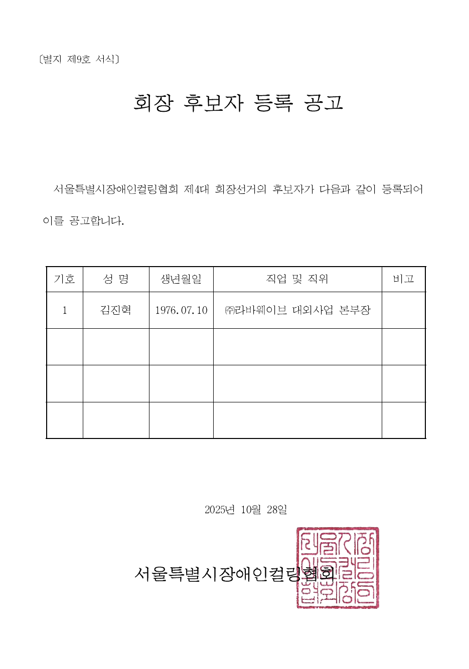 서울특별시장애인컬링협회 회장 후보자 등록 공고