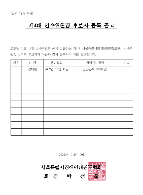 서울특별시장애인태권도협회 제4대 선수위원장 후보자 등록 공고