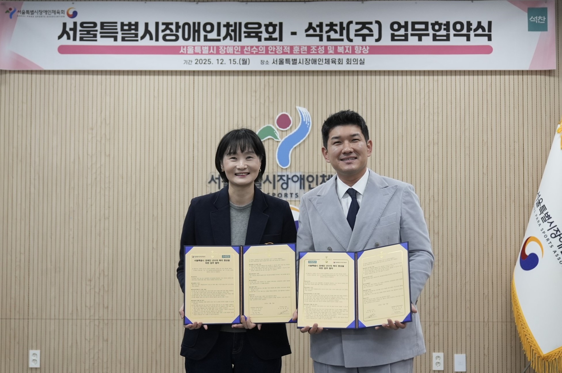 서울특별시장애인체육회 회의실에서 ㈜석찬(대표 채동찬)과 장애인 선수 복지 향상 및 훈련환경 개선을 위한 업무협약(MOU)을 체결했다.